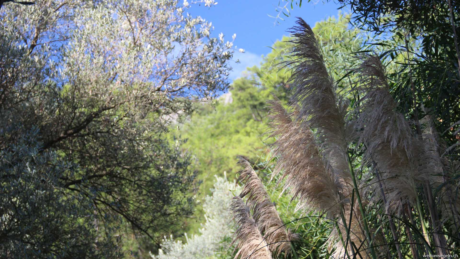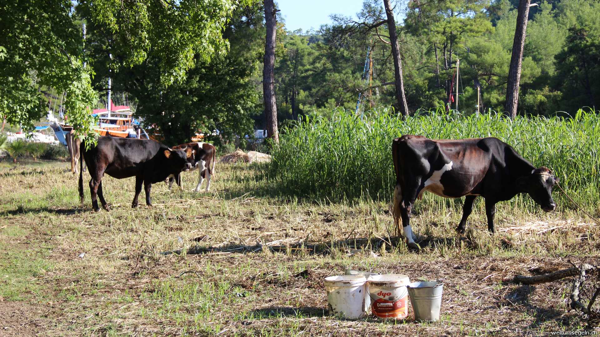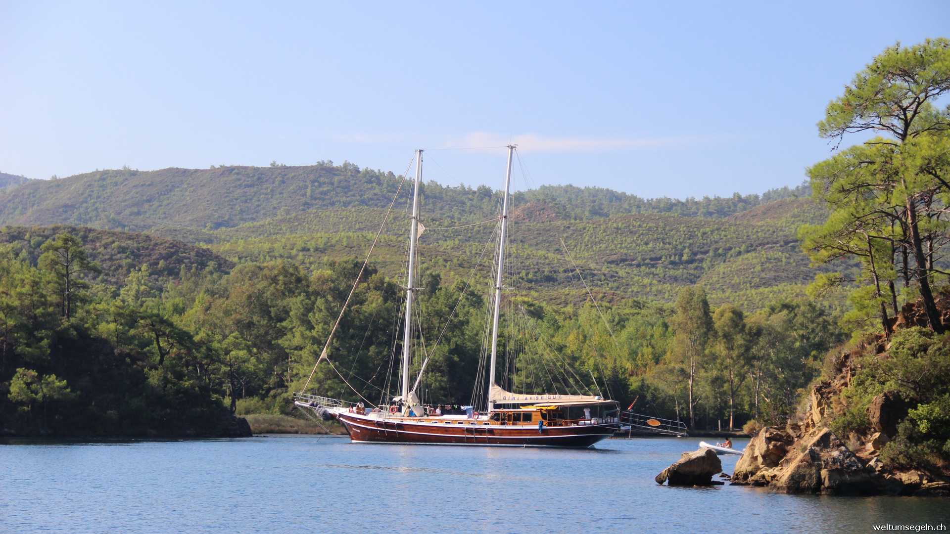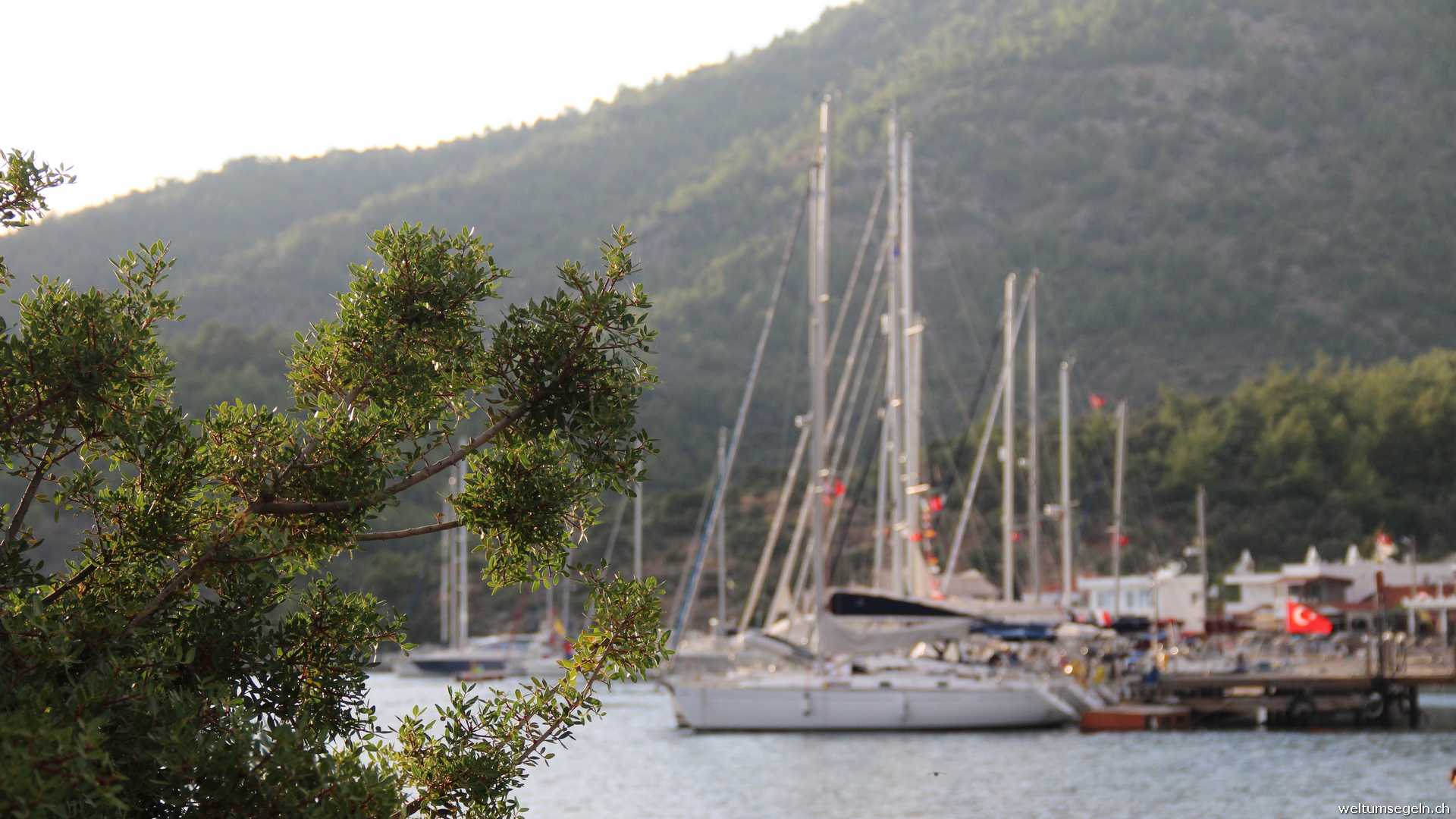 Sagarena segelt mit 7 Bft und gerefften Segeln nach Cökertme. Nette Aussichten sehen wir am Ende der Bucht in Form vieler Restaurants. Nach dem Anlegemanöver erkunden wir unser neues Umfeld. Nicht weit entfernt vom Meer sind wir in einer üppig grünen und bergigen Landschaft.