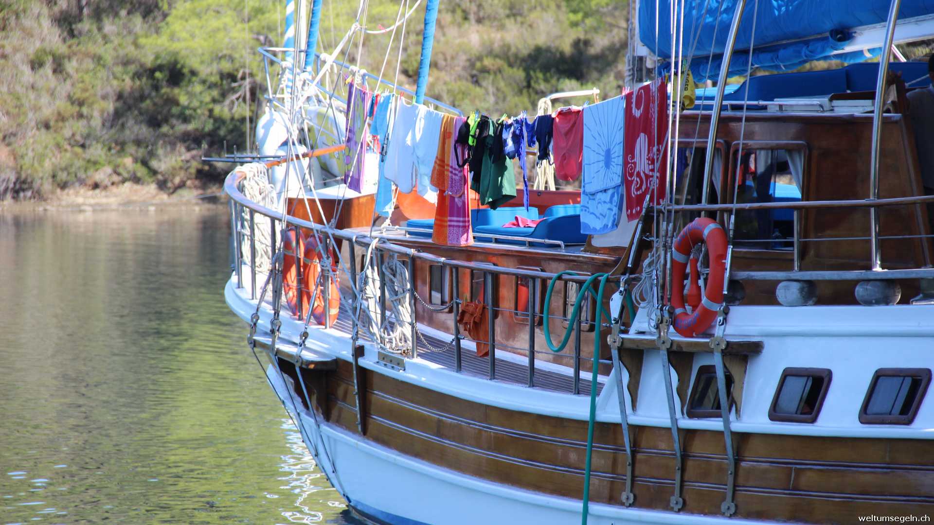 Noch haben wir einen Abend zum Geniessen. Wir beschliessen in die Bucht von Degirmen Bükü zu segeln. Wir sehen kurz zum English Harbour rein und beschliessen am Ende der Bucht bei dem Restaurant anzulegen. Das leckere Essen möchten wir nicht verpassen. Frischer Fisch muss wieder auf den Tisch und Frühstück möchten wir auch. Am Steg ist munteres Treiben zu beobachten, nette Nachbarn laden zum Kaffee ein. Eine Gület legt zum Wasser bunkern an. Schnell ergeben sich Kontakte mit der jungen Crew. Eine Einladung zur Besichtigung nehmen wir gerne an. Auch an Sagarena ist man interessiert.