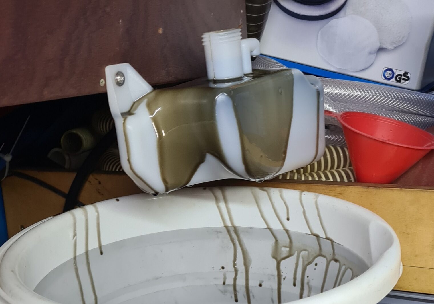 Der letzte grosse Schock war als zum Expansionsgefäss der Motorenkühlung Oel kam. Nach 2 Jahren sprang der Motor sofort an, erst nach 20 min. Lasttest ereignete sich die Schweinerei. Der Grund war ein defekter Oelkühler. Einen neuen wird von Holland nicht nach Italien geliefert. Der Wechsel der Kühlflüssigkeit und das Motorenöl waren die Folgen.