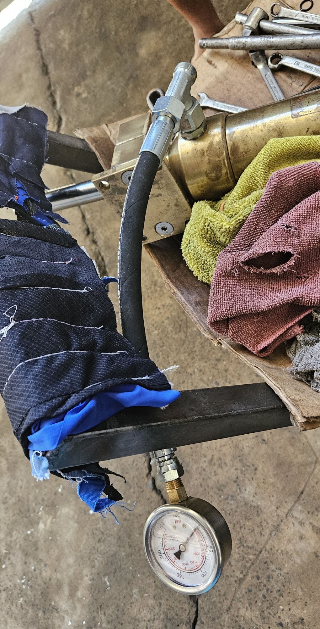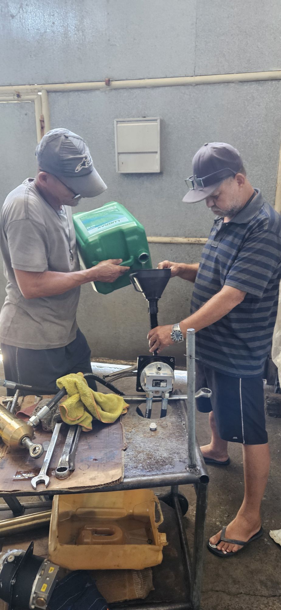 Ich demontiere wieder einmal die ganze Hydraulik Anlage und fahre per Uber mit zwei Zylinder und zwei Pumpen zu einer Hydraulik Firma. Als erstes fahren wir zu dritt zu zwei Hydraulik Zubehör Anbieter. Die Adapter für die Druckmaschine und zwei Meter Schlauch für den Test Pumpe zum Zylinder.